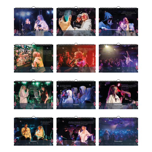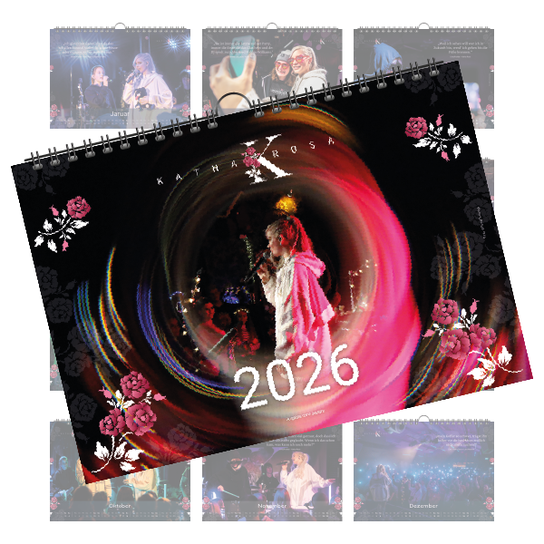 Erlebe Katha Rosas besondere Supernova Tour mit jedem Monat neu! Dieser exklusive Wandkalender im Format DIN A3 begleitet dich durchs Jahr 2026 und zeigt beeindruckende Momentaufnahmen der Tour – von magischen Bühnenmomenten bis zu intimen Backstage-Eindrücken.